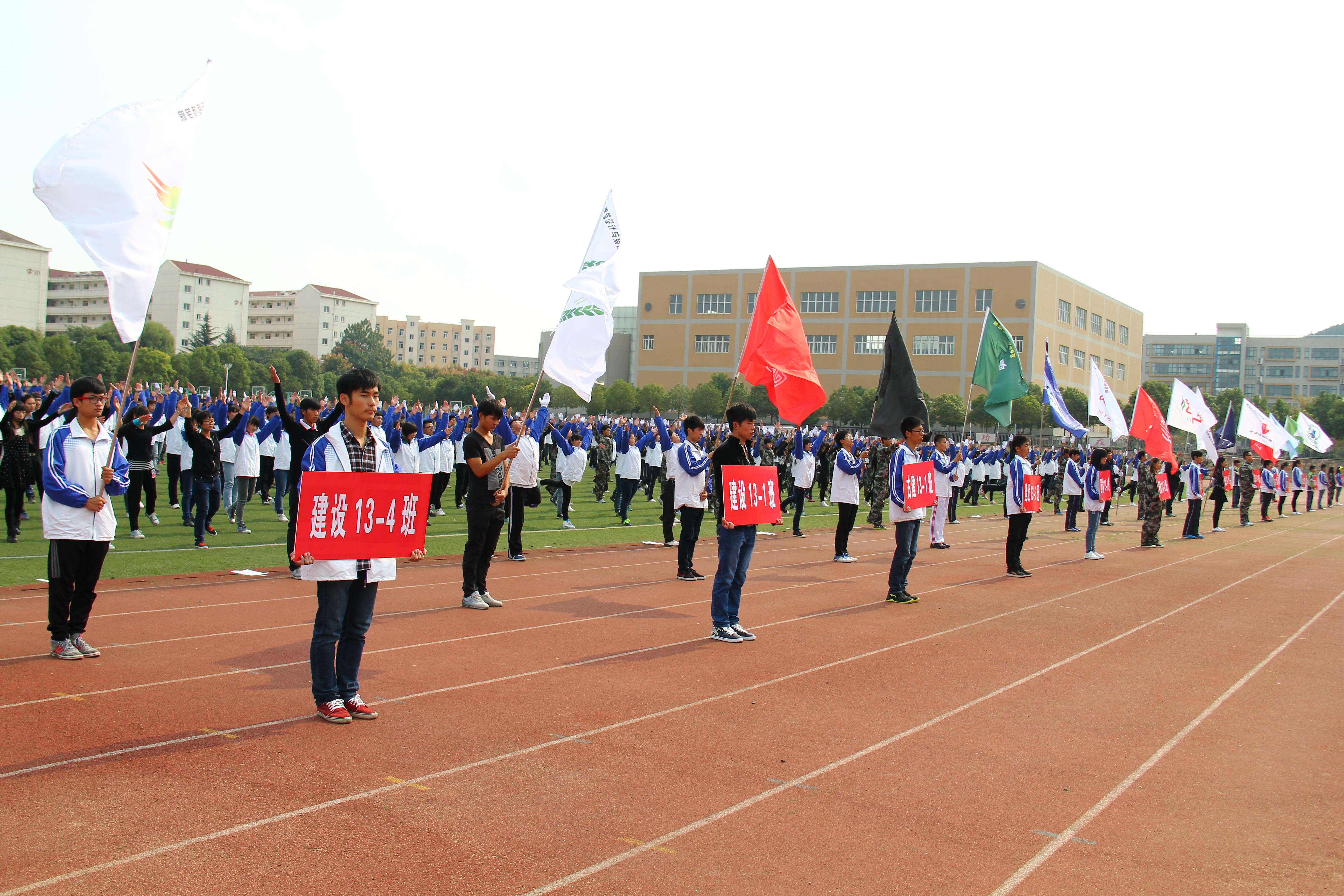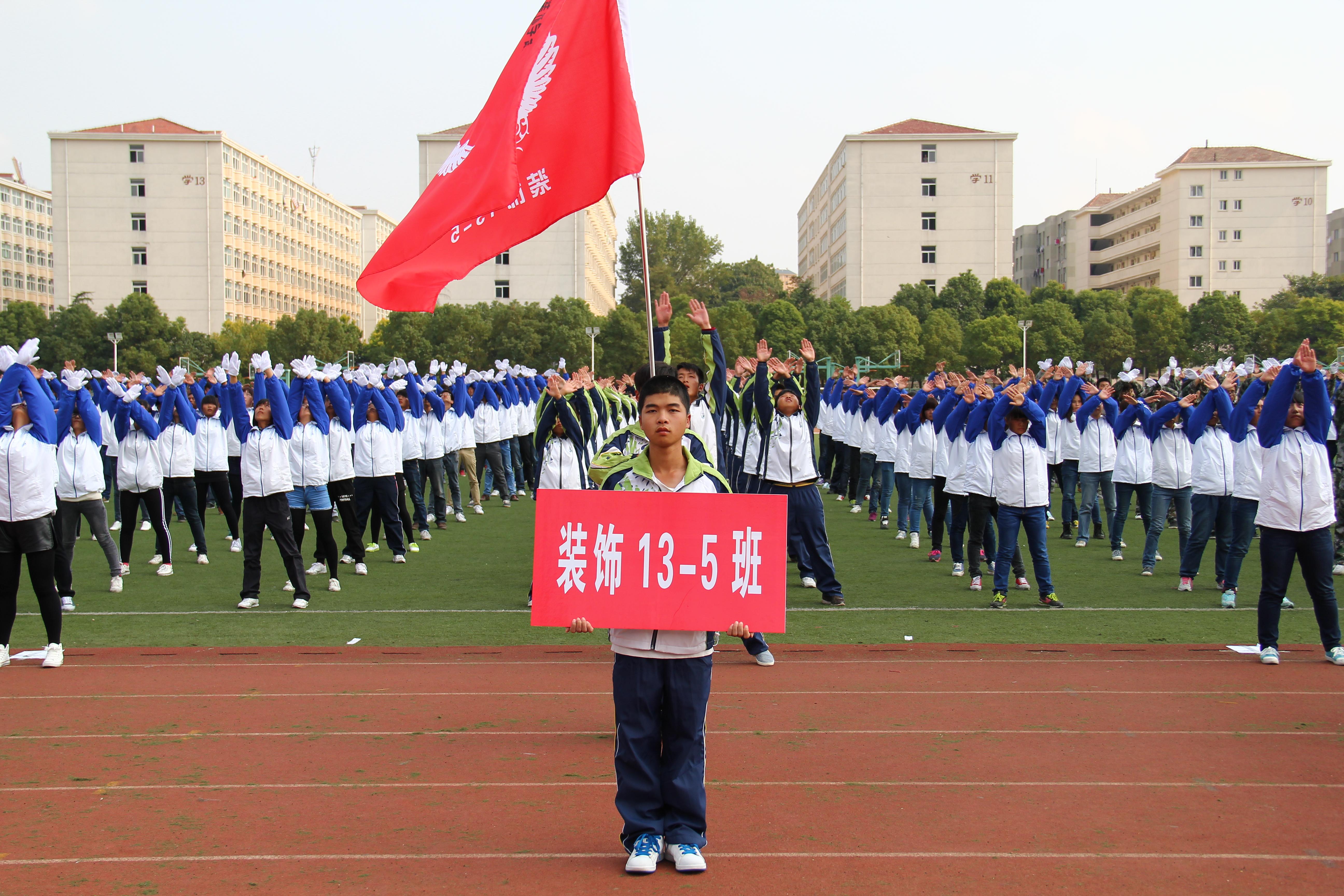在比赛中,各参赛班级都精心准备了个性的班旗,凝练了激昂的口号,“感闯敢拼,永不言败”、“放飞梦想,创造辉煌”,口号响彻全场,震撼人心。在接下来的广播操比赛中,各班级同学穿上整齐的比赛服装,伴随着第九套广播操音乐,配合高度默契,动作整齐划一,成为比赛场上一道亮丽的风景。