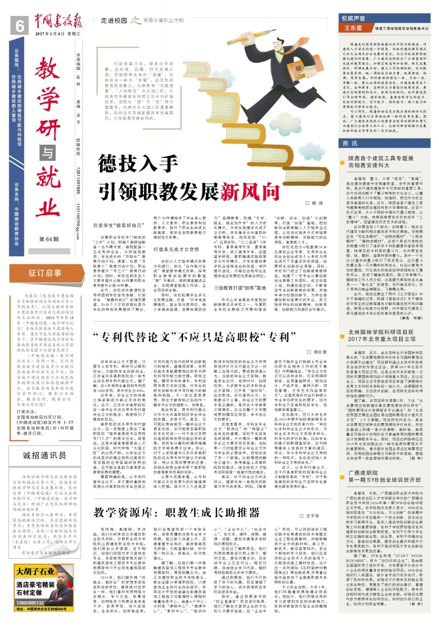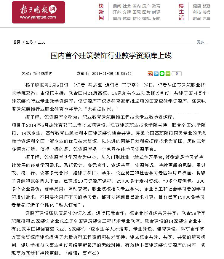 国家级建筑装饰工程技术专业教学资源库自2014年立项建设,两年多来,建设团队按既定时间节点保质保量地完成建设任务,受到了多家媒体关注。1月4日,《中国建设报》以“教学资源库:职教生成长助推器”为题;1月6日,《扬子晚报》以“国内首个建筑装饰行业教学资源库上线”为题等进行了宣传报道推广。