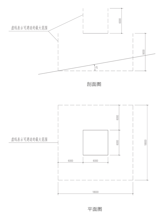 本次竞赛为设计者提供了一个略具抽象的基地,在绵延坡度为10度、18m×18m投影见方的场地正中上方,还有一块6m×6m见方的空中水平基地,建筑的可建造范围将被限定(任意小于但不超过)在如图虚线所示的两个立方体范围内,上部立方体为6(长)×6(宽)×6(高)m,下部立方体为18(长)×18(宽)×9(高)m。场地朝向自定,气候可根据参赛者家乡所在地的具体气候或假想为寒冷的、炎热的、多雨的、干旱的、多风的、阳光充足的......,环境可以是丛林、草地、沙滩......,功能安排在上部立方体范围内须为居住,下部立方体范围内功能不限(居住或其他),但上下功能需能并置成立。上述朝向、气候、环境不限但必须自我设定。
