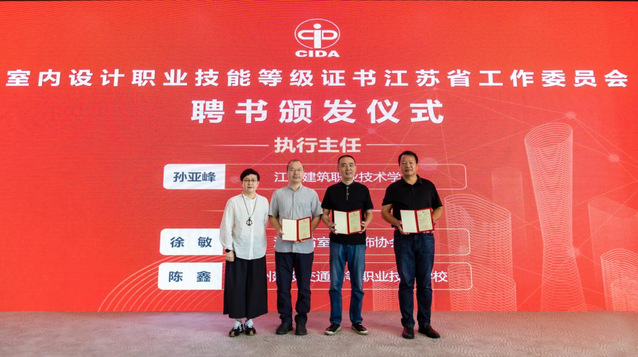 随后,由刘珝名誉会长、张丽会长和曾凡远副经理共同为室内设计1+X团队培训基地和室内设计职业技能等级证书江苏省工作委员会揭牌,并为执行主任孙亚峰教授和副主任徐敏教授、陈鑫教授颁发聘书。