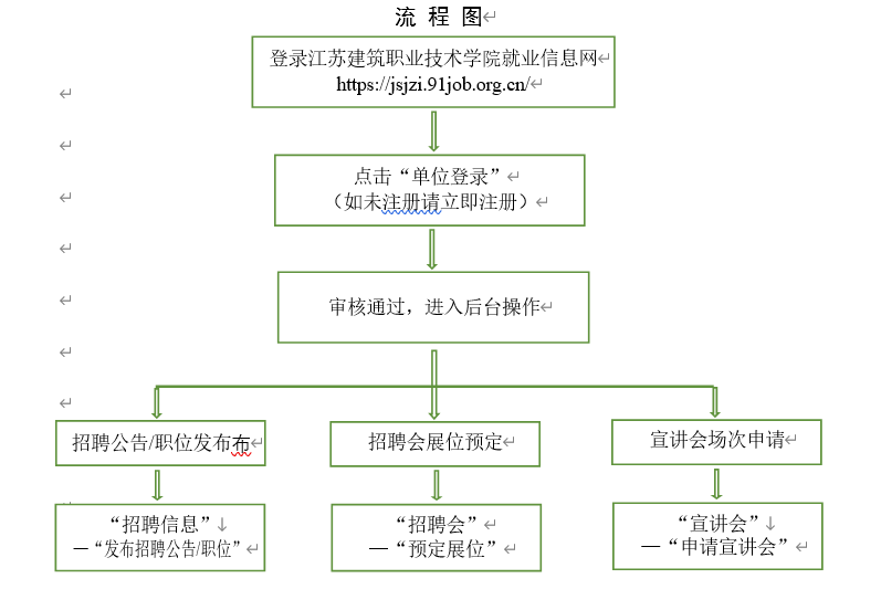 (一)非疫情中高风险地区,符合公司线下招聘条件的用人单位应至少提前5个工作日,登录伟德国际1946bv就业信息网(https://jsjzi.91job.org.cn/)进行宣讲会注册预约,申请通过后,电话与辅导员陈老师联系确定招聘时间与场地,办理进校手续。