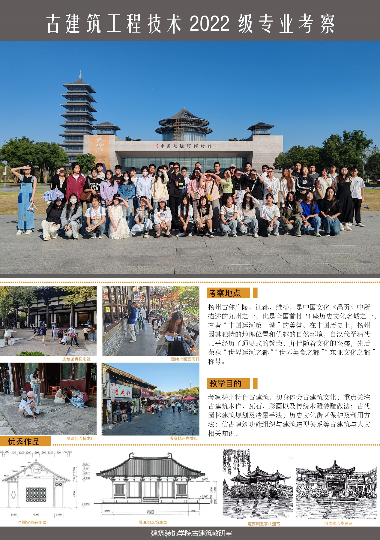 考察期间,同学们测绘了鉴真纪念馆、何园楠木大厅、个园宜雨轩、抱山楼、丛书楼等代表性古建筑,收集了古建筑营造数据,考察了扬州古建筑的木作、瓦石作、油漆彩画作以及木雕砖雕等做法,感受了极具特色的扬州园林造景手法,了解了东关街历史文化街区保护及利用方法和大运河文化,研究了古建筑功能组织与建筑造型之间的关系,并通过摄影、视频和速写等方式收集了专业素材,切身体会了博大精深的中国古代建筑文化。回校后,同学们认真完成了专业考察汇报,圆满完成教学任务。