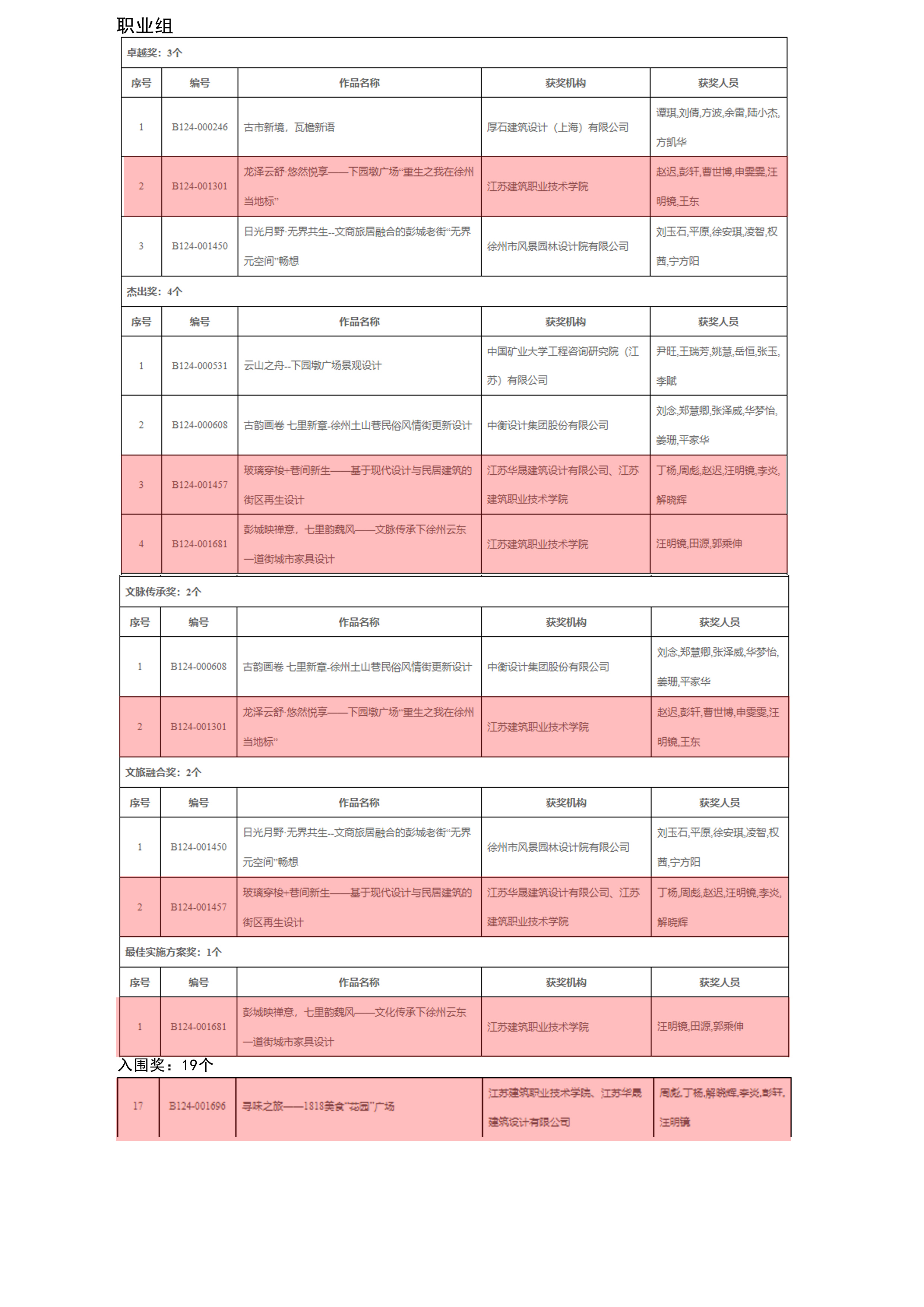 本次赛项共评选出职业组38个奖项,其中公司教师荣获7项奖项,其中赵迟、彭轩、曹世博、申雯雯、汪明镜、王东团队荣获1项卓越奖(共3项)、1项文脉传承奖(共2项);丁杨、周彪、赵迟、汪明镜、李炎、解晓辉团队荣获1项杰出奖(共4项)、1项文旅融合奖(共2项);汪明镜、田源、郭乘伸团队荣获1项杰出奖(共4项)、1项最佳实施方案奖(共1项);周彪、丁杨、解晓辉、李炎、彭轩、汪明镜团队荣获入围奖1项(共19项);员工组共评选16项奖项,由公司彭轩、赵迟、曹世博老师指导的焦九皋、张晓生、李朝启、王子鑫汇、卢忱玉员工团队荣获1项优秀奖(共2项)。
