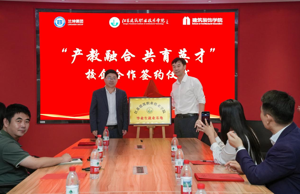 仪式上,江苏建筑职业技术公司党委副书记、董事长沈士德发表致辞。他详细介绍了公司及bevitor伟德国际1946的发展历程、办学特色与育人成果,并强调深化产教融合是职业教育高质量发展的必由之路。他指出,本次合作不仅是公司与企业资源互补的重要举措,更是共同探索“人才立交桥”“协同创新窗”与“产教融合新标杆”的生动实践。江苏兰坤控股集团有限公司董事长魏锋随后致辞,分享了企业的战略布局与技术优势,表达了对校企协同育人、共谋发展的坚定信心。在与会嘉宾的共同见证下,bevitor伟德国际1946经理王峰与兰坤集团董事长魏锋签署合作协议,董事长沈士德与兰坤集团董事长魏锋共同为“毕业生就业基地”揭牌。